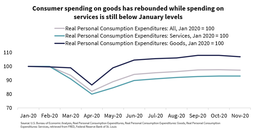 In addition, about 65% of consumer spending is on services, and consumer services have not fared as well as consumer goods during the pandemic. Vaccines should provide a boost for services, but innovative e-services for online healthcare, education, fitness, and finance could all be improved.
