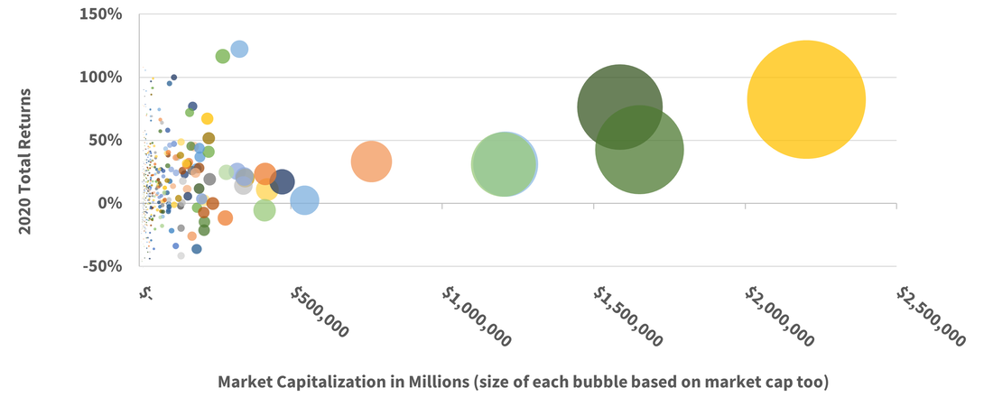 64% of the companies in the S&P 500 had positive returns in 2020, but these companies represented 81% of the S&P 500 market capitalization - highlighting how a few of the largest companies have carried the index this year. Tesla (743% return) & Etsy (302% return) are not displayed.