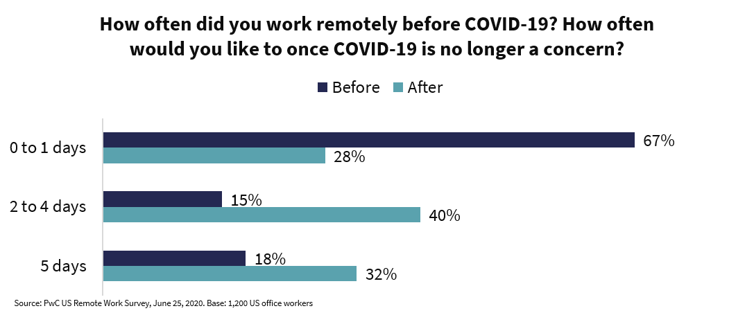 There is broad consensus for such an environment too, 89% of executives surveyed said many or most of their employees would be able to work from home at least one day per week, from the same survey.